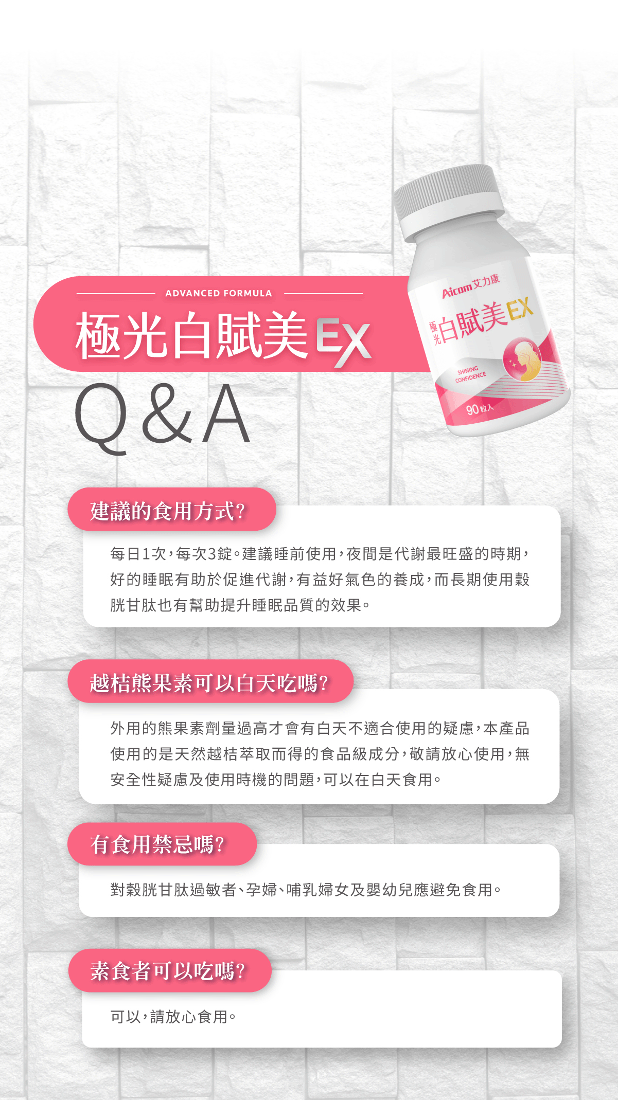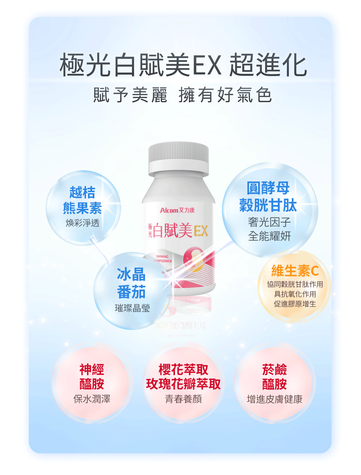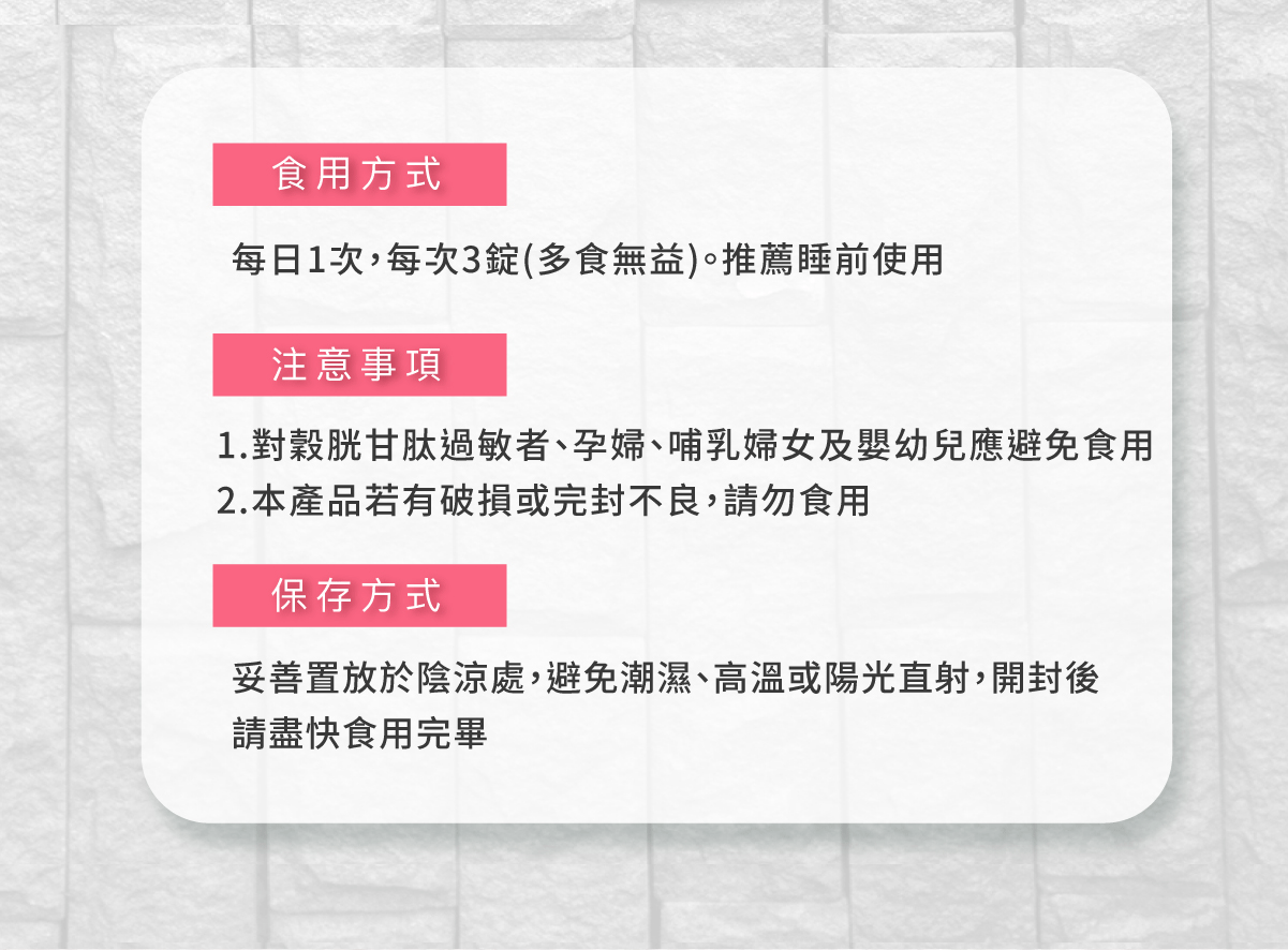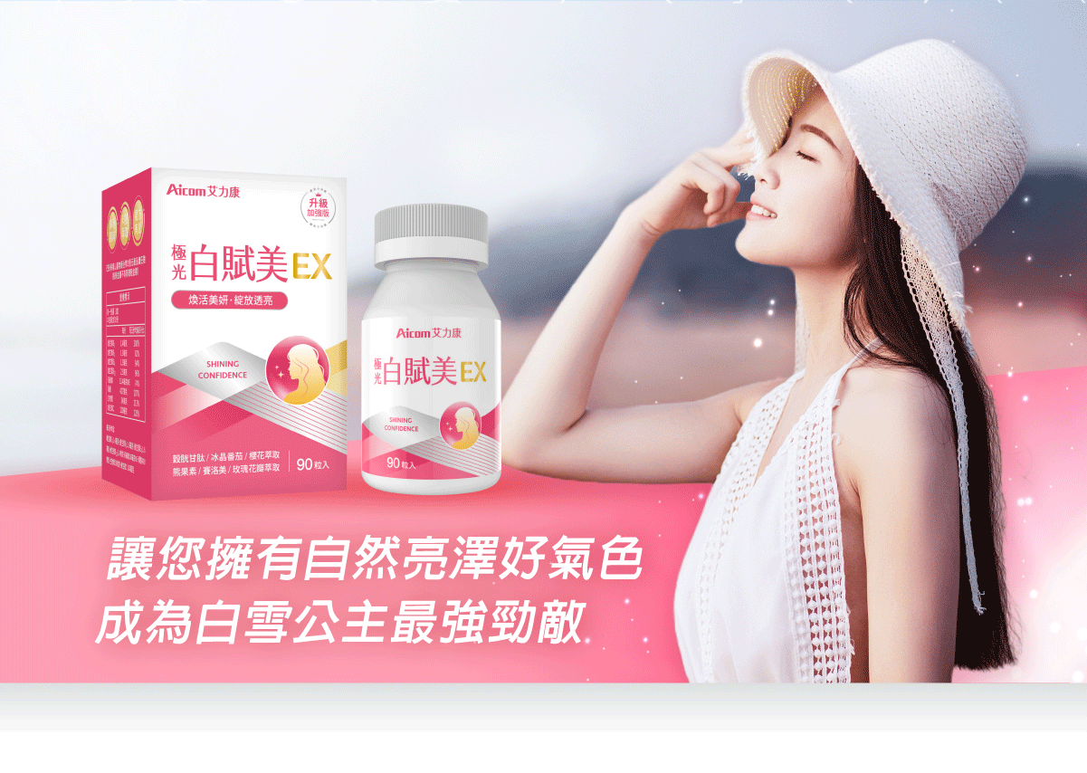盒內附色階卡,建議和肌膚放一起拍照前後對比, 多數人在14天自兩個色階。 睡前使用還能同時提升睡眠品質。 成份說明商品名稱:極光白賦美EX 主成分(每粒):圓酵母穀胱甘肽、維生素C、綜合維生素B群(菸鹼素、葉酸、、生物素、維生素B12、維生素B6、維生素B1、維生素B2)、微結晶狀α-纖維素、冰晶番茄萃取物、熊果素(越桔萃取物)、神經醯胺(玉米胚芽萃取物)、櫻花萃取物、玫瑰花瓣萃取物、麥芽糊精、羥丙基甲基纖維素、硬脂酸鎂、二氧化鈦、聚乙烯吡咯烷酮、滑石粉、二氧化矽、聚乙二醇 內容量:90錠/盒 食用方法:每日1次,每次3錠(多食無益),推薦睡前使用 保存期限:三年 有效期限:如外包裝標示(西元年/月/日) 原產地:台灣 保存方式:妥善放置於陰涼處,避免潮濕、高溫或陽光直射,開封後請立即使用 產物保險:已投保南山產物新台幣2億元產品責任險 (投保金額不等同理賠金額) ◆國內負責廠商名稱 :艾康明生醫科技股份有限公司 ◆國內負責廠商地址 :407台中市西屯區黎明路二段798號 ◆國內負責廠商電話 :04-22519777 ◆產品責任險 :0960-2236006976-00 ◆食品業者登錄字號 :B-182893555-00000-4
