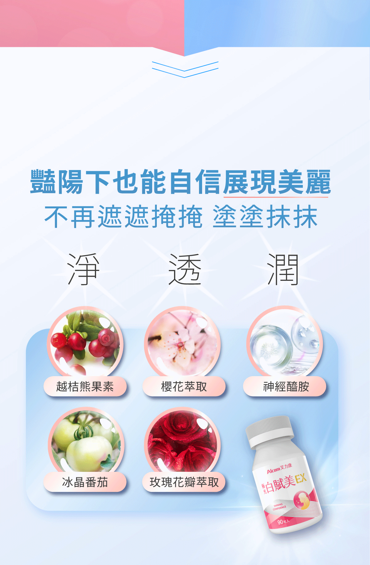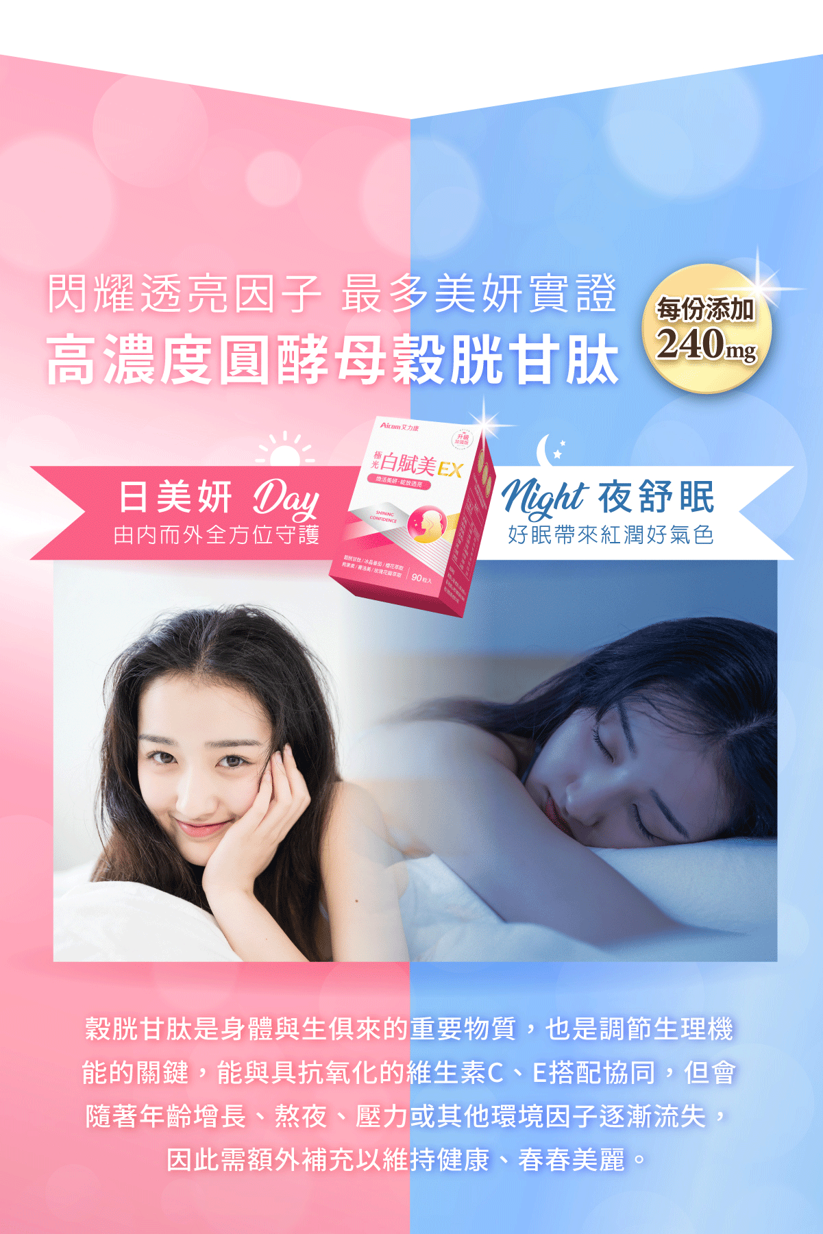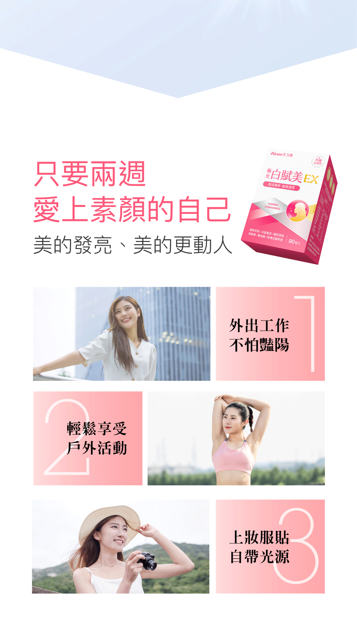 盒內附色階卡,建議和肌膚放一起拍照前後對比, 多數人在14天自兩個色階。 睡前使用還能同時提升睡眠品質。 成份說明商品名稱:極光白賦美EX 主成分(每粒):圓酵母穀胱甘肽、維生素C、綜合維生素B群(菸鹼素、葉酸、、生物素、維生素B12、維生素B6、維生素B1、維生素B2)、微結晶狀α-纖維素、冰晶番茄萃取物、熊果素(越桔萃取物)、神經醯胺(玉米胚芽萃取物)、櫻花萃取物、玫瑰花瓣萃取物、麥芽糊精、羥丙基甲基纖維素、硬脂酸鎂、二氧化鈦、聚乙烯吡咯烷酮、滑石粉、二氧化矽、聚乙二醇 內容量:90錠/盒 食用方法:每日1次,每次3錠(多食無益),推薦睡前使用 保存期限:三年 有效期限:如外包裝標示(西元年/月/日) 原產地:台灣 保存方式:妥善放置於陰涼處,避免潮濕、高溫或陽光直射,開封後請立即使用 產物保險:已投保南山產物新台幣2億元產品責任險 (投保金額不等同理賠金額) ◆國內負責廠商名稱 :艾康明生醫科技股份有限公司 ◆國內負責廠商地址 :407台中市西屯區黎明路二段798號 ◆國內負責廠商電話 :04-22519777 ◆產品責任險 :0960-2236006976-00 ◆食品業者登錄字號 :B-182893555-00000-4