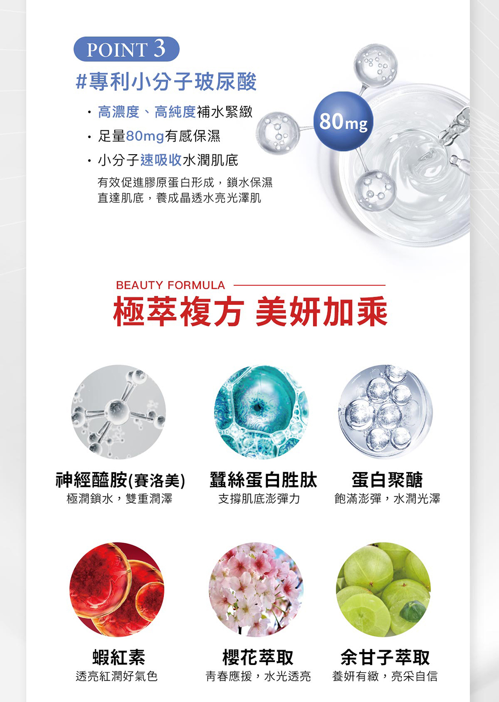 主成分(每包):水、蜜桃濃縮汁、膠原三胜肽、赤藻糖醇(甜味劑)、蘋果濃縮汁、蠶絲蛋白胜肽、維生素C、金絲燕窩萃取物(含燕窩酸)、流行鏈球菌發酵物(透明質酸鈉)、玉米胚芽萃取物(含神經醯胺)、余甘子萃取物、雨生紅藻萃取物(含蝦紅素)、櫻花萃取物、鮭魚鼻軟骨萃取物(含蛋白聚醣)、檸檬酸