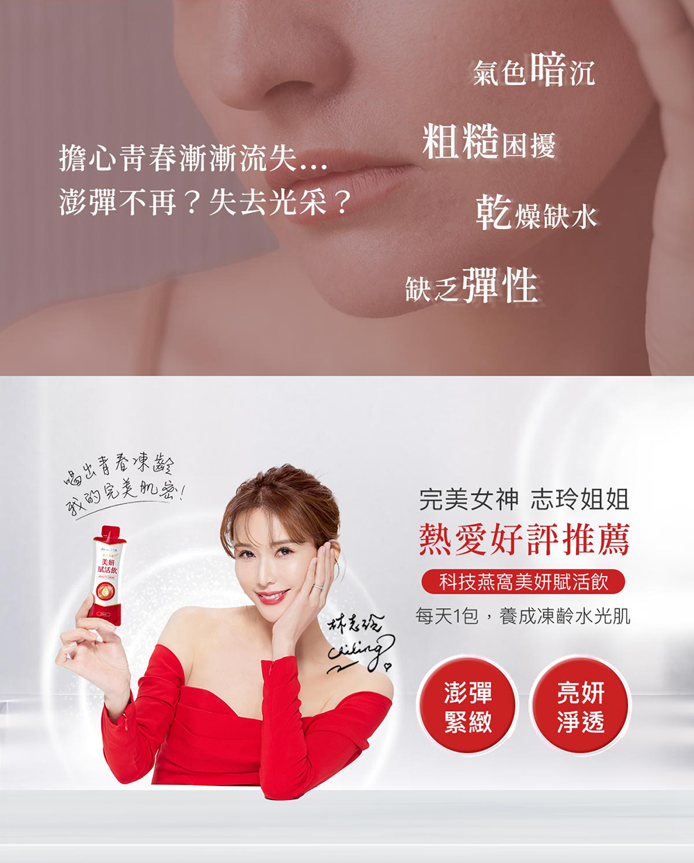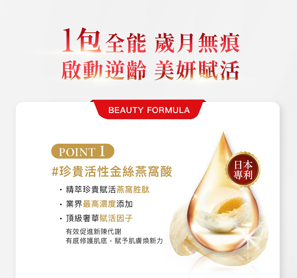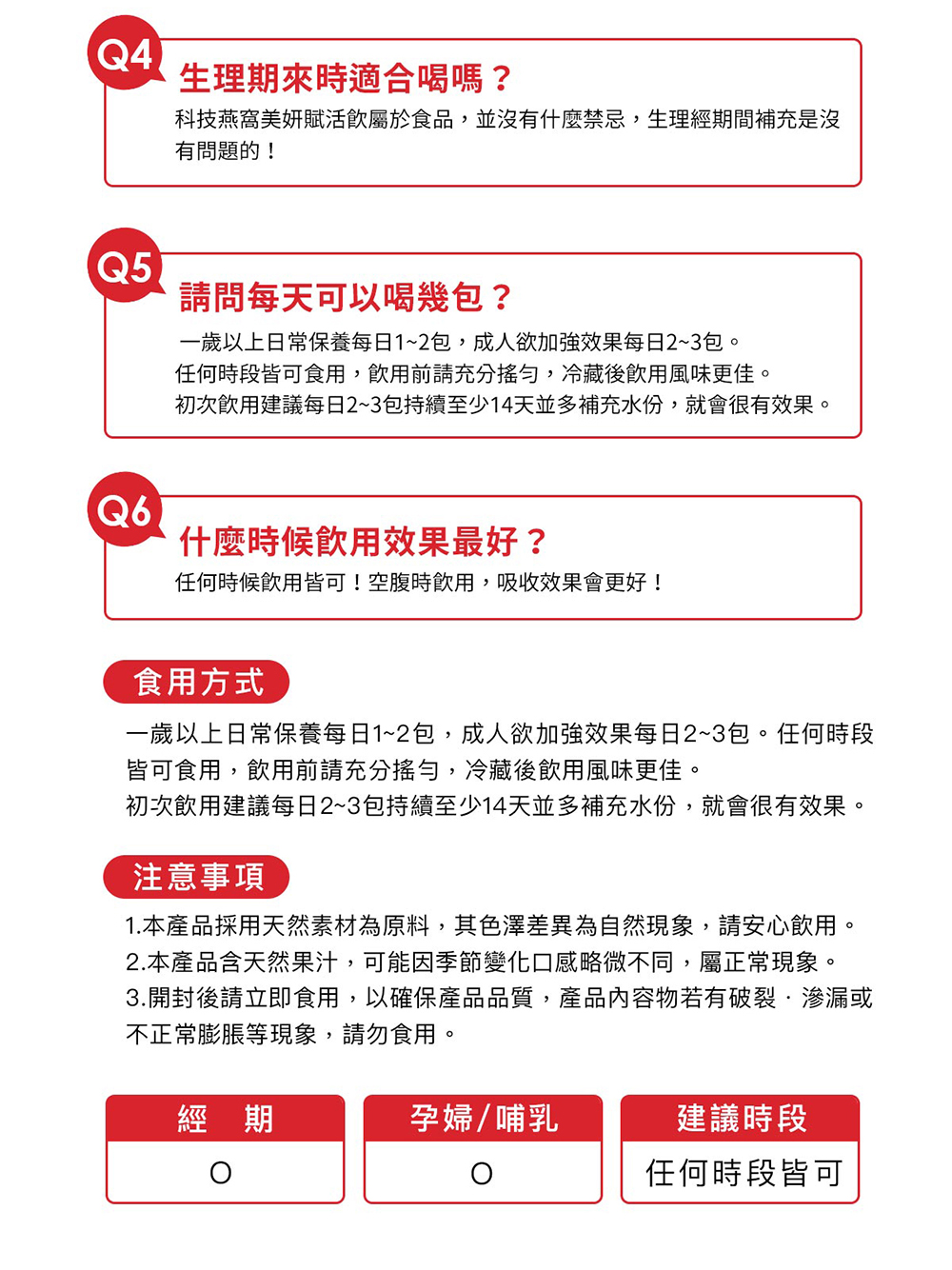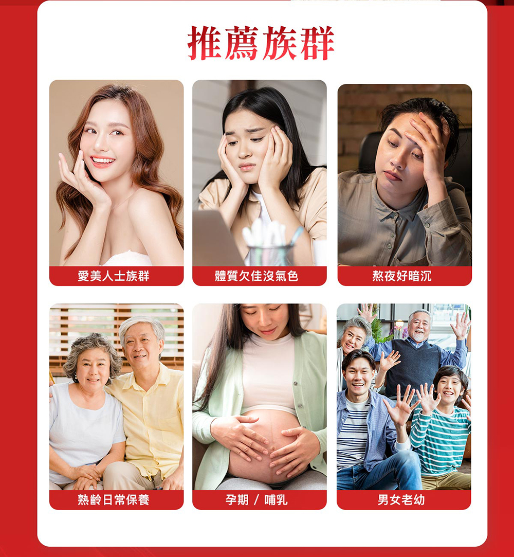 | A:從孕期至哺乳的女性都非常推薦飲用!「科技燕窩美妍賦活飲」中的燕窩酸是幫助寶寶成長的關鍵成分。從孕期開始食用,高濃度的燕窩酸及專利協同複方成分,除了幫助寶寶健康成長外,更能讓辛苦的媽咪快速恢復外在光彩及增強體力,做好產前與產後的補養! |