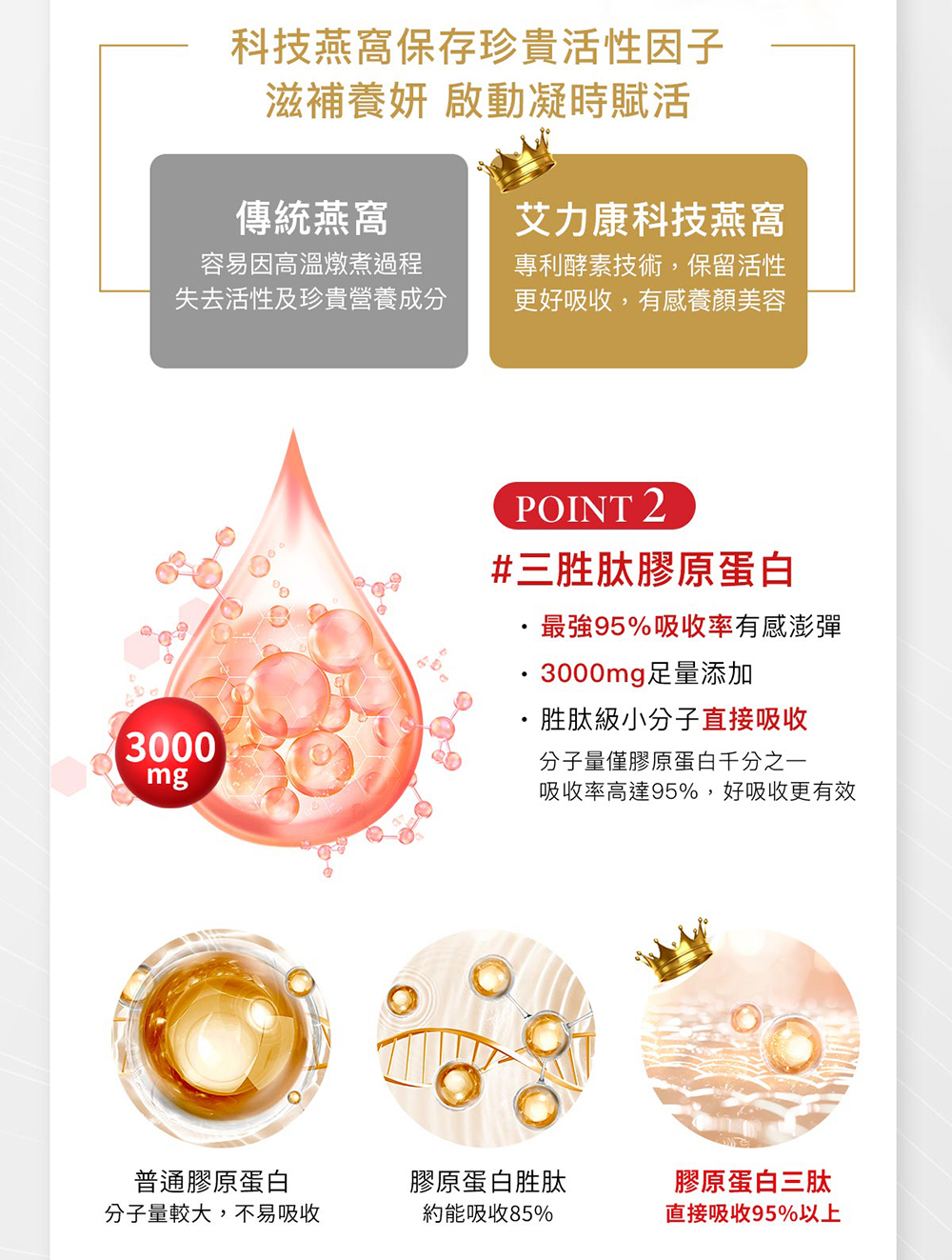 | A:「燕窩酸」是燕窩裡面的主要活性成分。Aicom艾力康透過生物科技萃取出高濃度燕窩酸,可以避免因傳統燕窩燉煮過程造成的失去活性與營養流失,並透過專利酵素處理技術,讓成分更易於人體吸收。 |